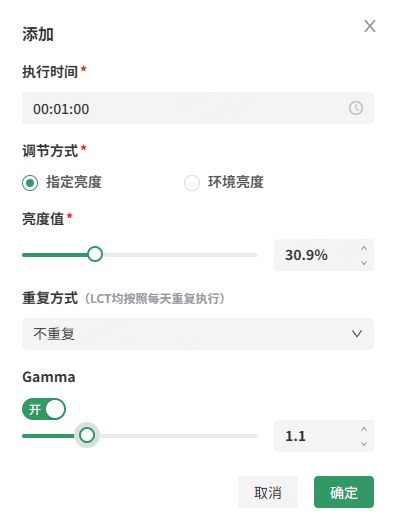 如需快速添加环境亮度和屏体亮度,单击“点击添加”,输入数值后单击“确定”。