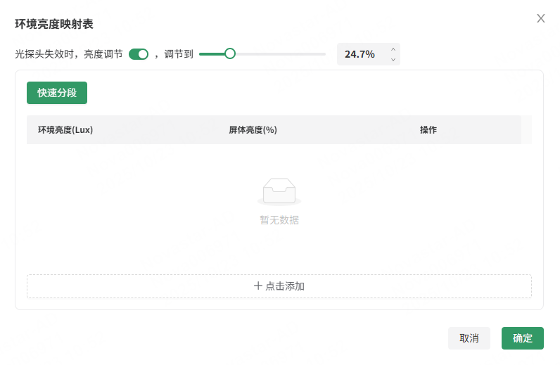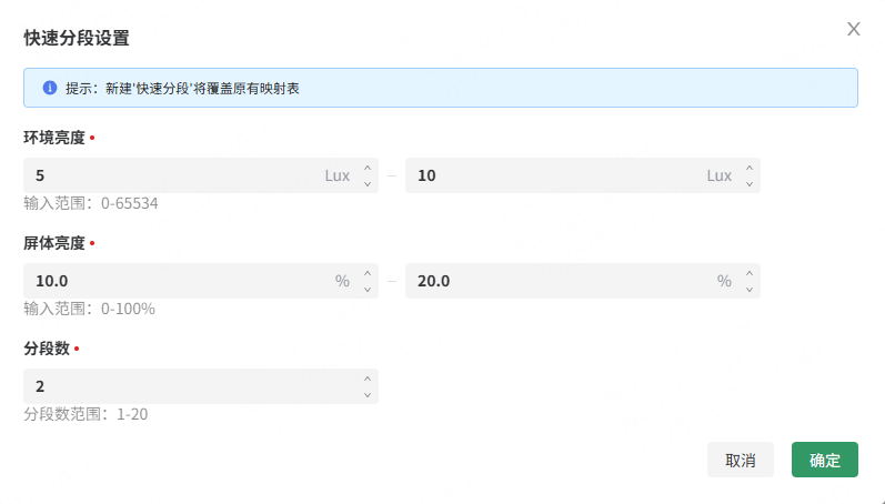 单击“快速分段”,在弹窗中设置“环境亮度”和“屏体亮度”的范围以及分段数,设置完成后单击“确定”。