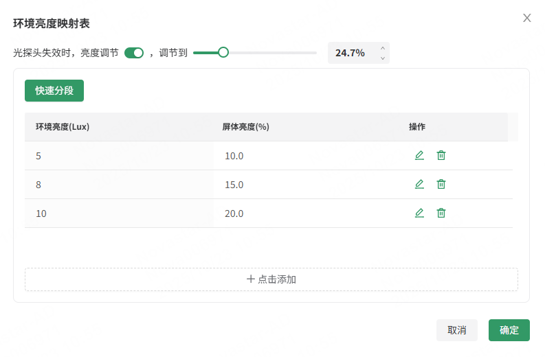 步骤5:(可选)当调节方式选择“环境亮度”时,可添加环境亮度映射表。