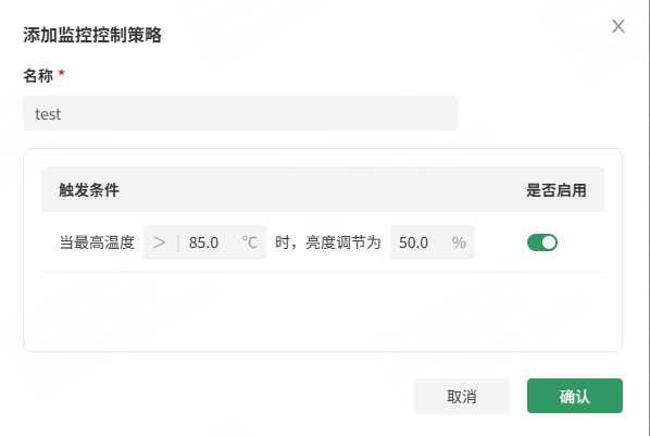 步骤3:在“添加监控控制策略”弹窗中,设置模版名称,并按需设置触发条件和启用开关。