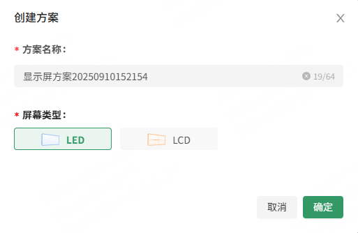 步骤3:在“创建方案”弹窗中输入方案名称并选择屏幕类型,单击“确定”。