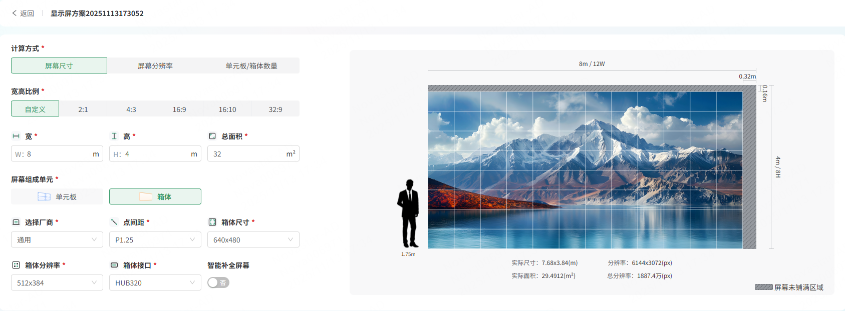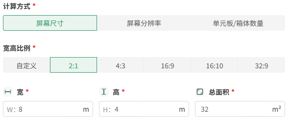 - 屏幕尺寸:设置宽高比以及宽(m)、高(m)、总面积(m²)。