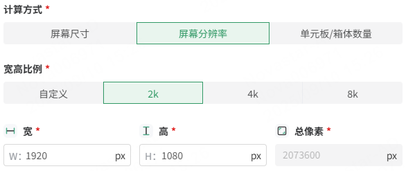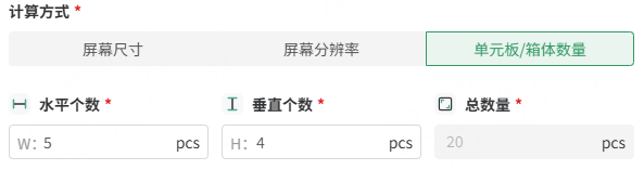 - 选择计算方式:可选择“屏幕尺寸”、“屏幕分辨率”和“单元板/箱体数量”。