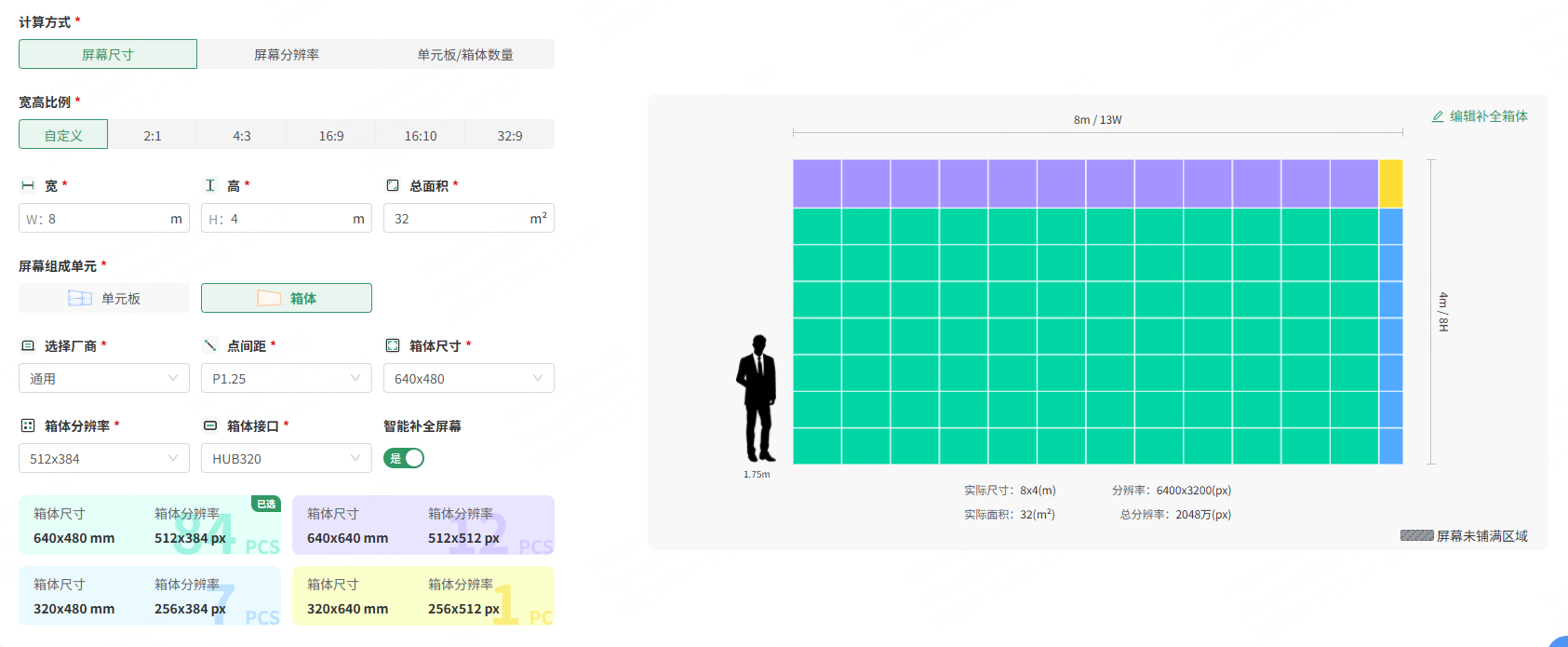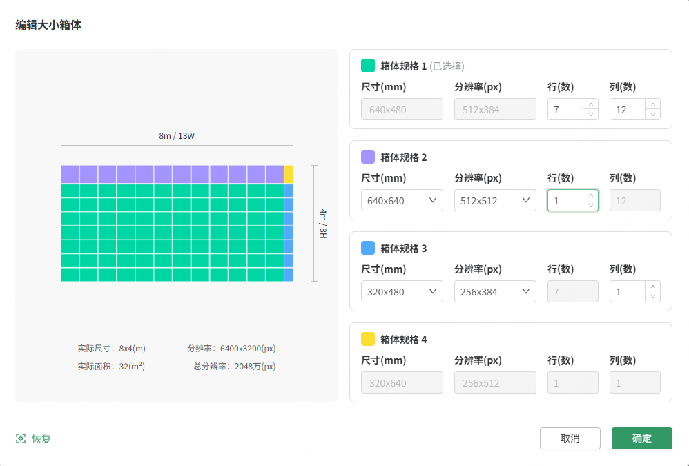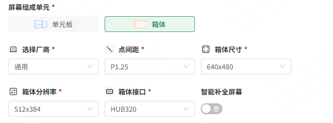 3、“智能补全屏幕”:屏幕组成单元选择“箱体”时可开启该功能,开启后,按照规则可智能补全屏幕,屏体实时预览颜色会根据不同的箱体规格展示。