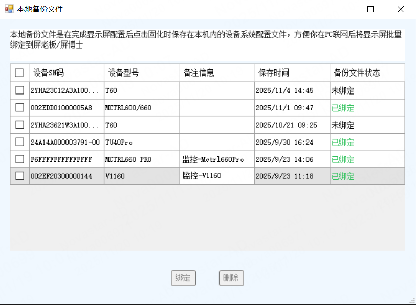 在进行绑定操作时,如选用的方式为在施工阶段备份绑定,即可在绑定显示屏的同时,将系统配置文件及屏体数据自动进行备份。