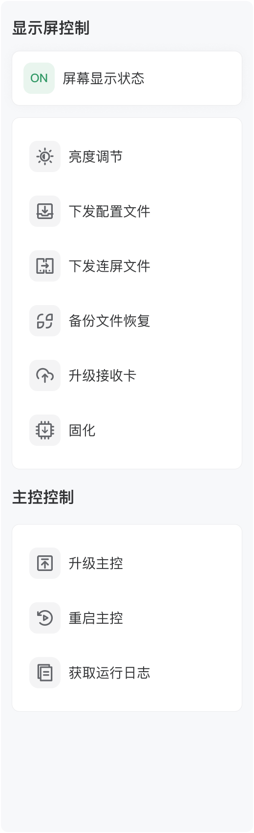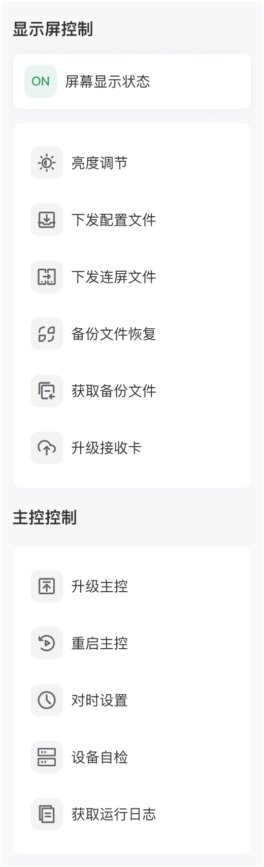 屏幕状态控制、亮度调节、下发配置文件、下发连屏文件、备份文件恢复、接收卡升级、升级主控、重启主控、获取运行日志、对时配置、设备自检、获取备份文件。