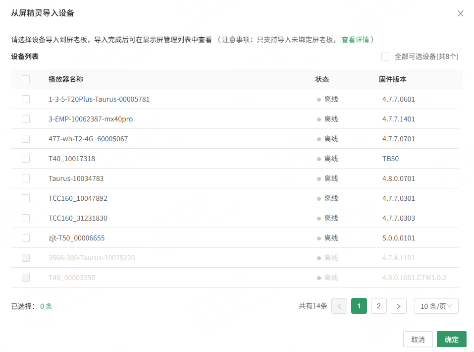屏老板Web端支持一键导入已绑定至屏精灵的设备。可以将大量已完成固装且使用屏精灵进行发布的屏体快速绑定至屏老板,使其能够通过屏老板进行运维监控,无需重复绑定即可实现从发布到运维的全方位服务。