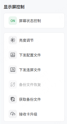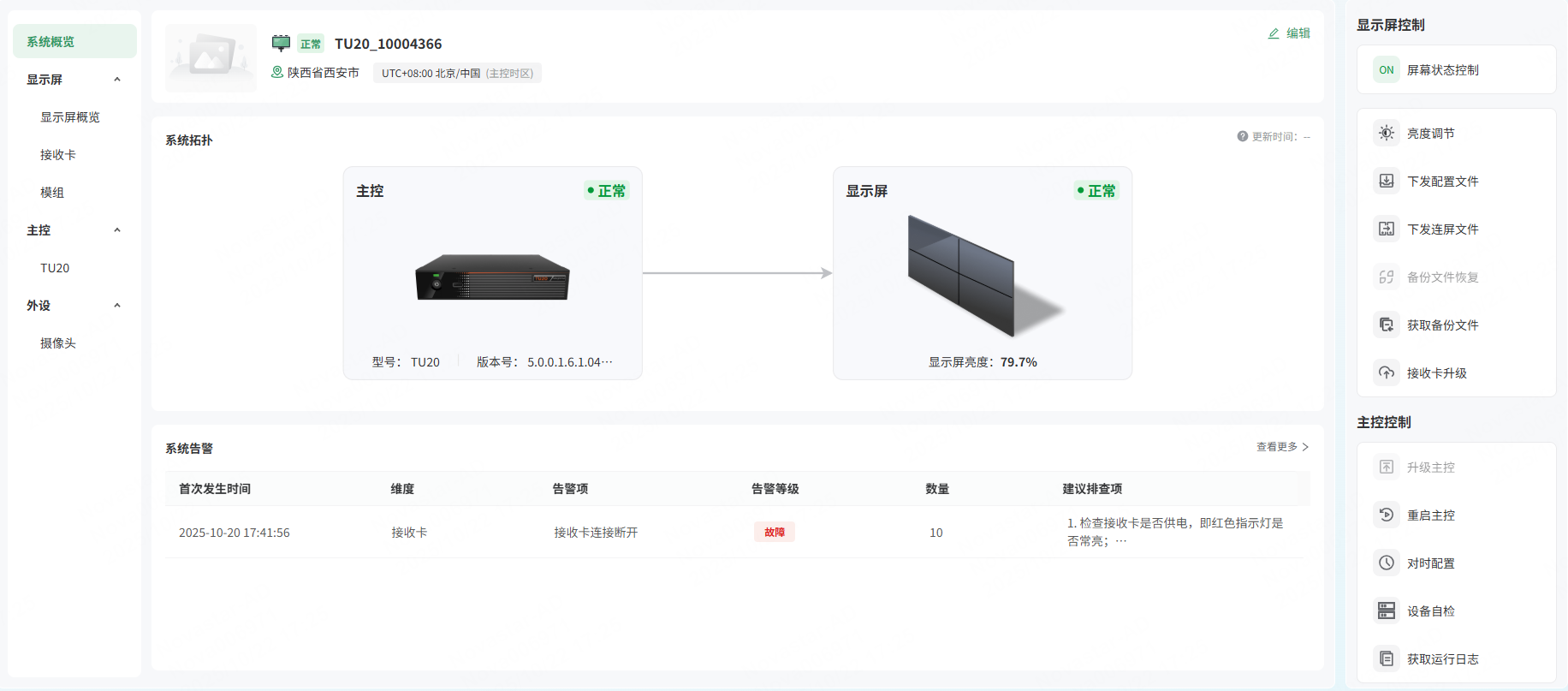 用户可在显示屏“监控运维”页签中查看当前显示屏、主控和外设当前的状态和相关信息,也可对显示屏和主控进行控制,包括画面控制、亮度调节、下发配置文件、备份文件恢复、升级接收卡、对时设置、重启主控和升级主控等多项功能,对显示屏进行集中管理和全面监控。
