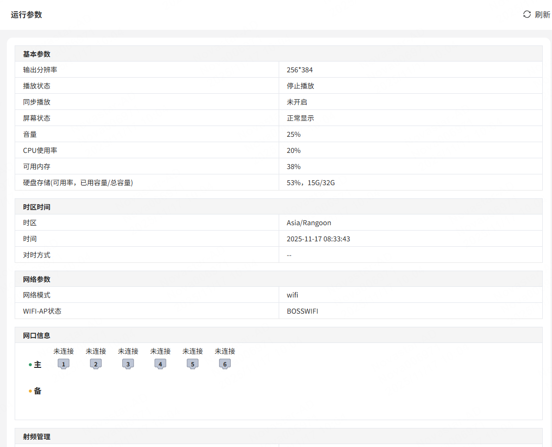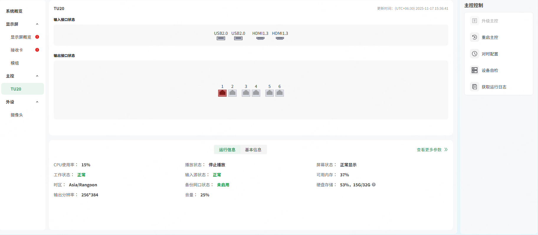 - 运行信息:展示主控运行参数信息,包括CPU使用率、播放状态、屏幕状态、工作状态、输入源状态、可用内存、硬盘存储、备份网口状态、时区、输出分辨率、音量等信息。