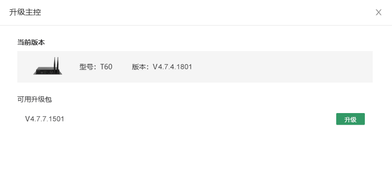 单击“升级主控”,在弹窗中可查看当前设备版本和可用升级包,选择要升级的版本后,单击“升级”。在提示弹窗中单击“确定”,等待升级完成。