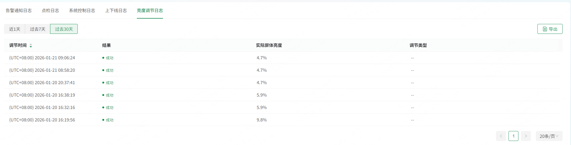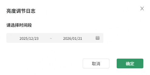 在界面右上角单击“导出”,在弹窗中设置时间段后,单击“确定”。可在本地查看导出的亮度调节日志。